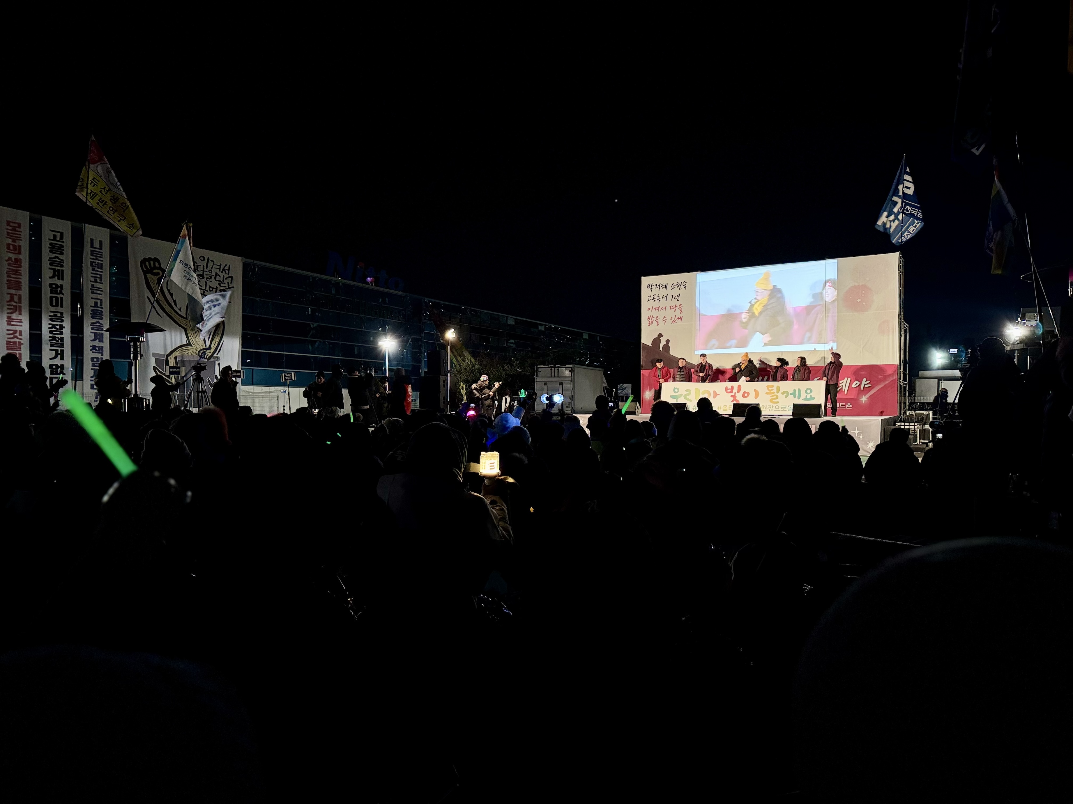 불탄 공장 마당은 새로운 '광장'이 되었다. 박정혜·소현숙 두 해고노동자의 곁으로 색색의 응원봉과 깃발이 모여 어둠을 밝혔다. 논바이너리, 직장인, 여성, 청년, 해고노동자, 그리고 또 다른 무엇인 많은 시민들이 지역 곳곳에서 구미 공장으로 모였다. "우리가 빛이 될게, 함께 이겨 땅을 딛자"며 연대의 '희망텐트'에서 한밤을 보냈다.