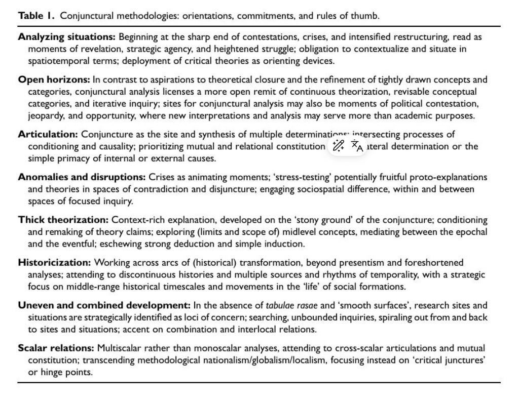 conjunctural analysis는 추상적인 것, 구조적인 것, 역사적인 것을 구체적이고 특수하며 현실적인 것을 통해 다룬다. 그것은 구체적인 상황의 특수성과 개별성을 그 자체로 하나의 관심 지점으로 삼을 뿐 아니라, 이를 통해 시스템적이고 세계적이며 일반적인 것을 독해하고, 지도화하고, 자리매김하려 한다. 이 접근은 언제나 변화하는 지형 위에 (종종 혼란을 불러오는) 개입을 시도하며, 사회적 타당성과 정치적 긴급성을 고려할 뿐, 어떤 특정한 진입점이나 순간을 특권화하지 않는다. 따라서 이 분석은 일관되게 경계를 넘어서고, 지평을 확장하고, 성급한 결론을 거부한다. 문제나 상황 속으로 ‘뚫고 들어가는(breaking in)’ 방법론적 행위는 항상 흐름의 중간(midstream)에서 일어난다. 그것은 결코 고립된 것이 아니라 ‘사이에서(in medias res)’, 즉 사물들 한가운데에서 발생하며, 맥락화하고 역사화해야 할 의무에 본질적으로 연결된다(Tooze, 2021 참조).