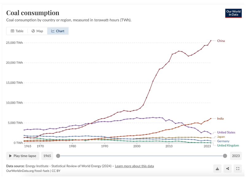 중국의 부상, 그리고 그것이 국가 단위 석탄 소비로 요약되는 세계.