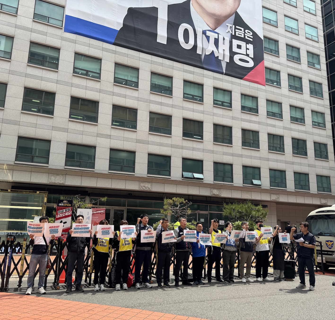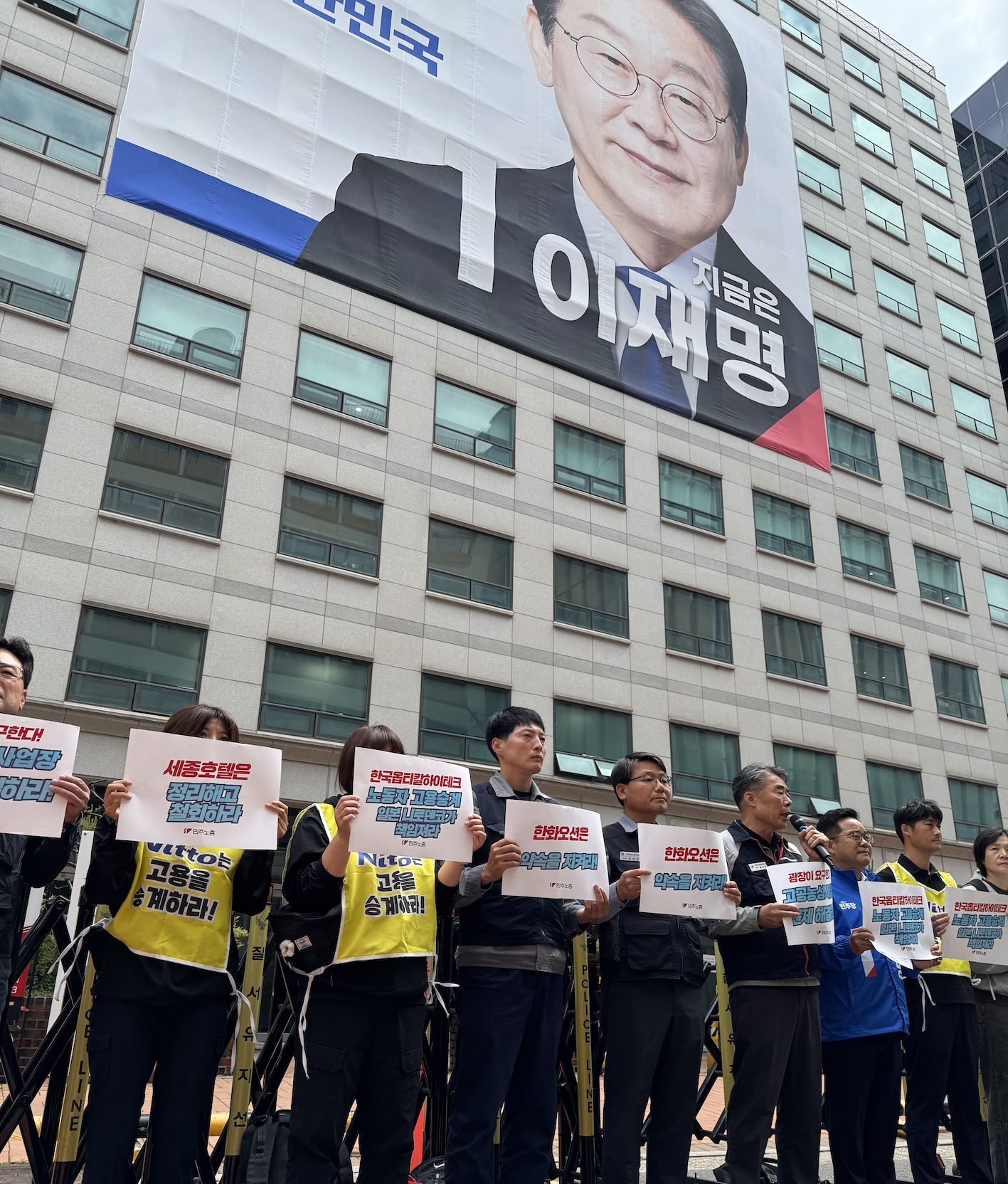 이재명 후보 캠프 앞에선 고공농성 사업장 노동자들. 참세상