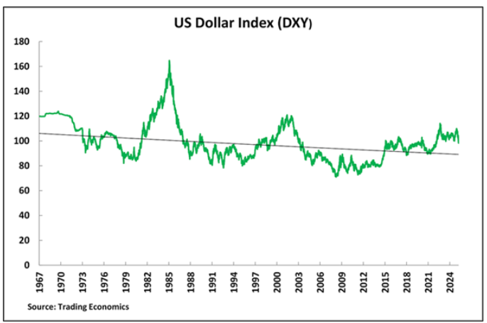달러 가치는 1월 이후 약 9% 하락했고, 4월 한 달 동안에만 4.5%나 떨어졌다. 하지만 트럼프의 관세 발작 이후에도 달러 지수는 10년 전과 거의 비슷한 수준을 유지하고 있다.