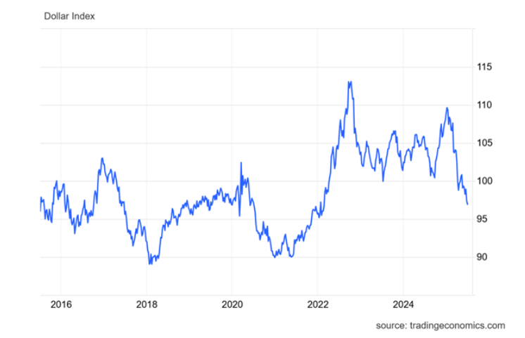 사실 도널드 트럼프가 1월에 취임한 이후, 미국 달러는 다른 주요 통화 대비 3년 반 만에 최저 수준으로 떨어졌다. 그의 관세 발작(tariff tantrums)과 예측 불가능한 정책 반전은 국제 무역과 투자자들에게 달러로 자산을 보유하는 것이 과연 적절한지에 대한 불확실성을 키웠다.