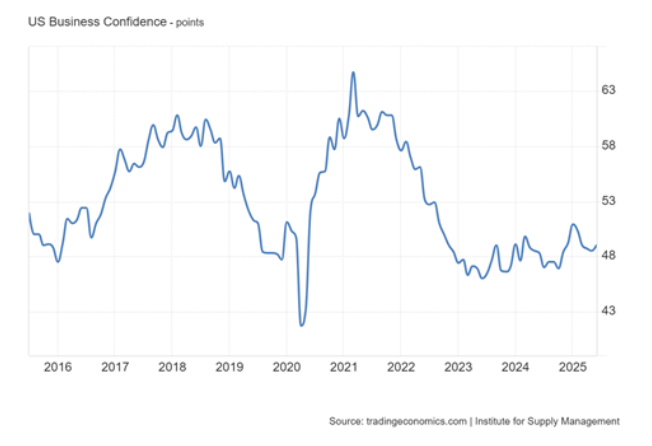 이 수치는 G7 주요 국가 가운데 캐나다와 미국이 유럽 국가들보다 두 배 가까이 더 좋은 성과를 내고 있음을 보여준다. 유럽 경제는 침체 상태에 머물러 있고, 이제 미국마저 그 침체에 동참하고 있다. 미국의 최근 실질 GDP 자료는 0.5% 하락을 보여주며, 미국 제조업은 여전히 수축 국면(지수 50 미만)에 머무르고 있다.