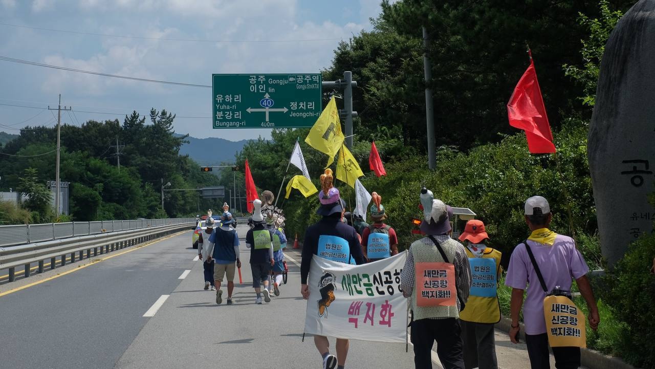 기록적 더위가 걸어야 할 이유가 되기도 하는 새, 사람 행진. 새,사람행진단/새만금신공항백지화공동행동 제공.