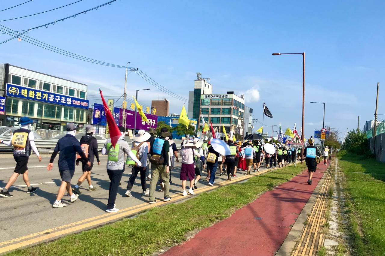“네 알겠습니다!”라는 대꾸가 절로 나오는, 달리 표현할 바 없는 당혹스런 심정이 그대로 전해지는 현수막을 만난 건 행진 18일차(8월 29일) 천안역에서 성환역으로 향하던 길에서였다. 행진을 시작한 8월 12일만 해도 며칠 지나면 더위가 좀 수그러들겠거니 했다. 하지만 8월이 다 가도록 한낮 기온은 30도를 가뿐히 넘어갔고, 오후에 15km 내외의 행진을 마치고 나면 옷에는 진한 소금꽃이 피었다. 찬물로 씻고 선풍기 바람을 쐬어 봐도 달궈진 얼굴은 밤에도 쉽게 식지 않았다.