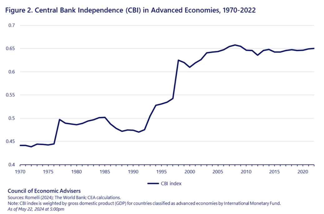 이 접근법은 1980년대와 1990년대에 들어 ‘국제적’으로 확산되었다. 세계은행과 국제통화기금의 주도로 점점 더 많은 국가들이 중앙은행의 “탈정치화”를 도입했고, 일부 다른 경제 의사결정 기술 부문에도 적용되었다. 아래 그래프는 최근 애덤 투즈(Adam Tooze)에게서 가져온 것으로, 1990년대 말부터 2008년 글로벌 금융위기까지 부유한 국가들에서 중앙은행의 독립성이 눈에 띄게 증가한 것을 보여준다. 이는 신자유주의적 세계화의 일부였고, 많은 개발도상국에서도 그대로 모방했다. 중앙은행의 독립성은 그런 세계관에서 절대적으로 필수적인 것으로 여겨졌다.