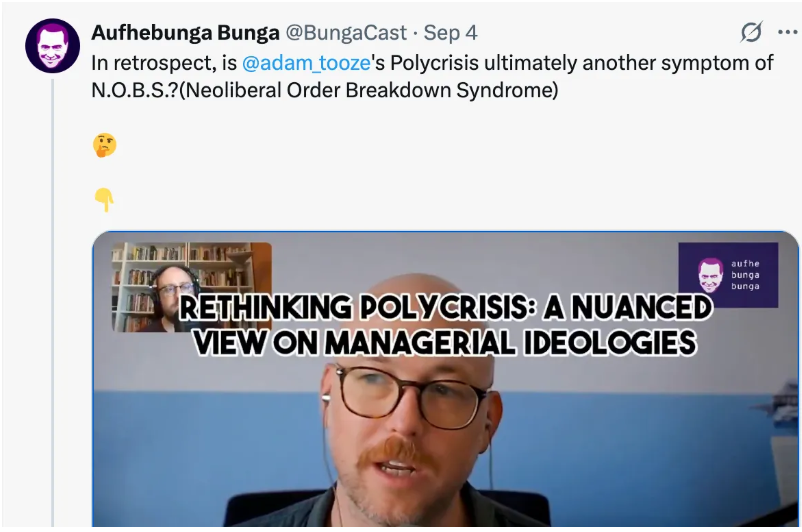 기묘하게도, 바로 이틀 전 내 친구들이 운영하는 팟캐스트 AufhebungaBunga가 다시 이 주제로 돌아왔다. 그들은 폴리크라이시스 담론을 신자유주의 질서 붕괴 증후군(Neoliberal Order Breakdown Syndrome)에 시달리는 관리 이데올로기(managerial ideology)의 시각으로 진단했다.