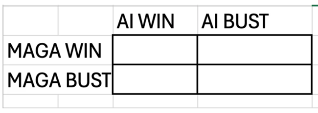 하이퍼스케일링-MAGA 동맹에는 두 파트너가 있으며, 각각 심대한 불확실성에 직면해 있기 때문에, 1차 근사로 우리는 미래 시나리오를 2×2 형태로 그려볼 수 있다.
