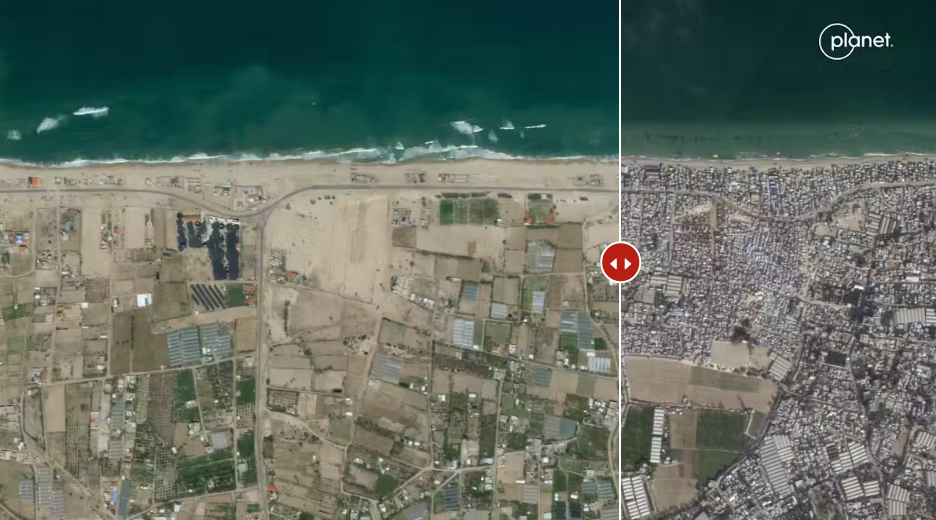 가자 남부의 알마와시(al-Mawasi) 인도주의 구역은 2023년 5월(왼쪽)에는 모래밭 농지였지만, 2025년 9월에는 난민 텐트촌으로 빽빽하게 채워졌다. 출처: 플래닛 랩스(Planet Labs)