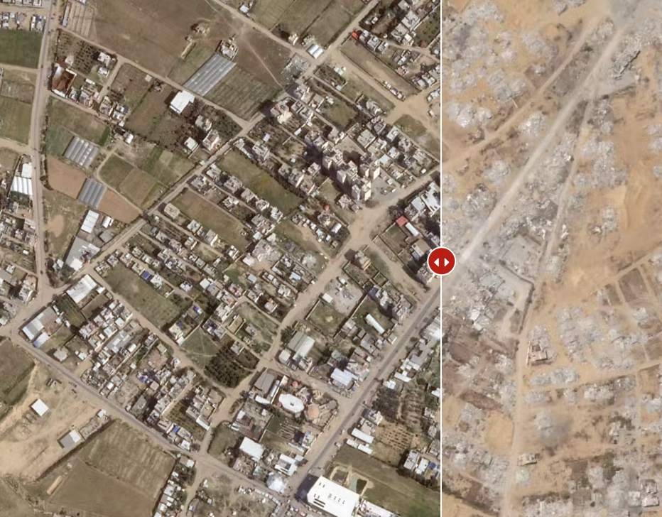 칸유니스(Khan Yunis) 남동쪽에 위치한 쿠자아(Khuza'a)의 파괴 모습, 2025년 5월 2일(왼쪽)부터 2025년 6월 16일까지. 출처: 플래닛 랩스(Planet Labs)