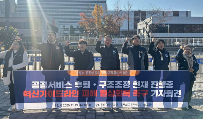 민주노총 공공운수노조는 19일 오전 10시, 용산 대통령실 앞에서 기자회견을 열고 윤석열 정부의 공공기관 혁신가이드라인으로 인해 파괴된 공공성과 노동권을 회복해 달라고 이재명 정부에게 요구했다. 이재명 정부는 지난 국정감사에서 공공기관 혁신가이드라인이 ‘관리종료’로 폐기되었다고 밝혔다.