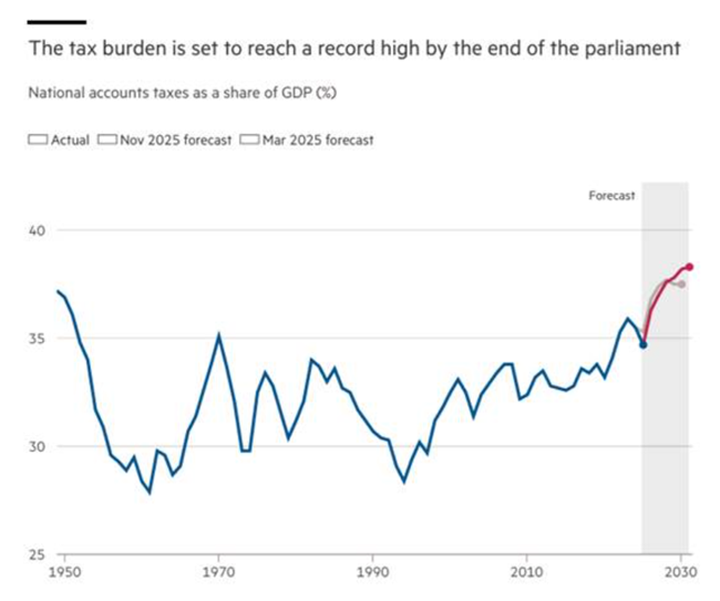 그렇다면 리브스는 어떻게 했는가? 정부 부채 증가를 막기 위해 필요한 재원을 마련하면서도 부유층에게 과세하지 않았다. 최고 소득자 세율도 올리지 않았고, 초부유층을 위한 부유세도 도입하지 않았다. 그 대신 그는 중산층·평균 소득자에게 ‘스텔스 세금’을 부과했다. 리브스는 이 조치가 “일하는 사람들을 아프게 할 것”이라는 사실을 인정하며, “그렇지 않은 척하지 않겠다”고 말했다. 그 결과 노동당 정부 임기가 끝나는 2029년이 되면 세 부담이 GDP 대비 사상 최고 수준에 도달할 것으로 예상된다(물론 그때까지 정권이 유지될 경우다).