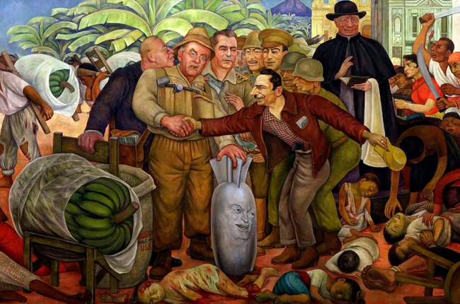 1954년에 그려진 이 그림에서 디에고 리베라는 중앙정보국(CIA)이 기획한 과테말라 침공과 그에 이은 쿠데타를 묘사했다. 이 작전은 하코보 아르벤스의 개혁 정부를 붕괴로 이끌었다. 출처: 푸시킨 미술관/위키미디어 커먼스
