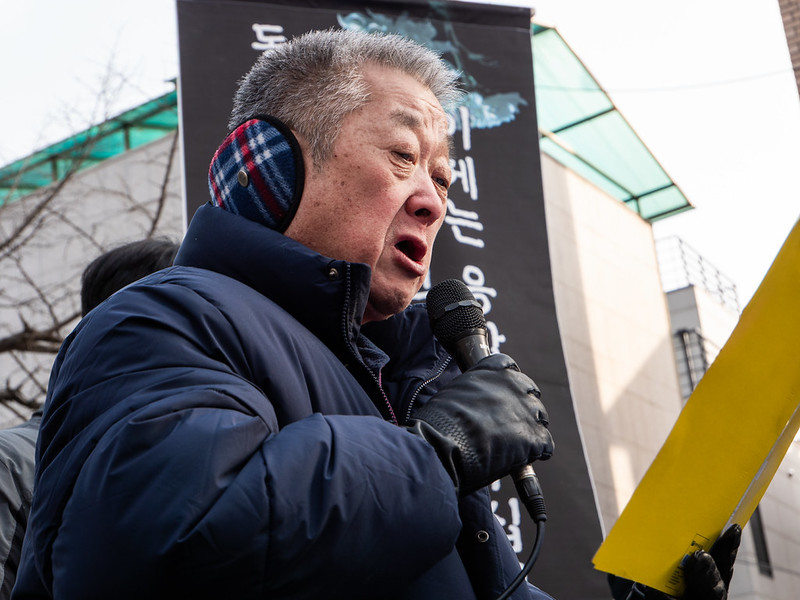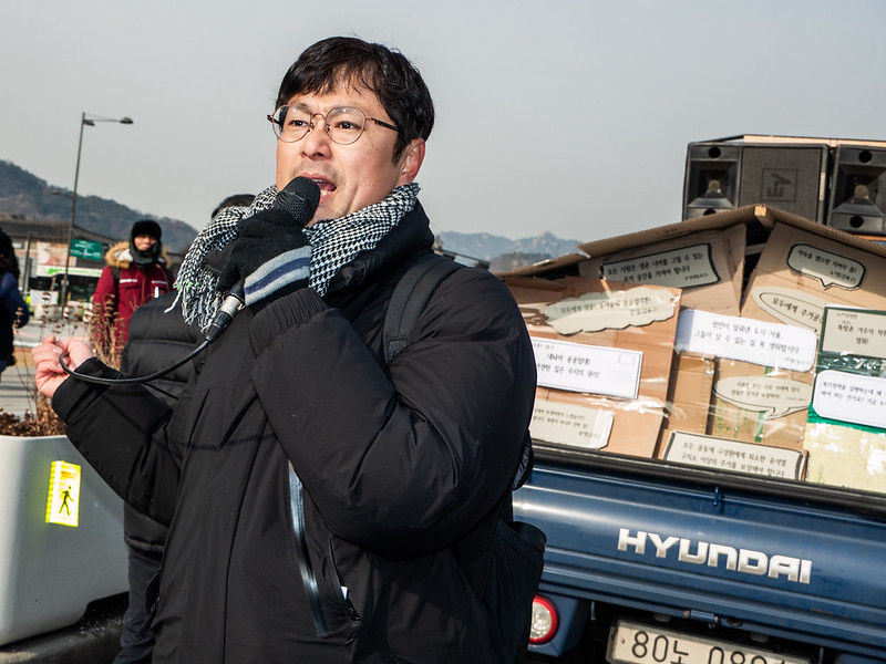 동자동 쪽방 공공주택 촉구 청와대 영정 행진 시작 전, 참여자들이 기자회견을 가지고 있다. 참세상 박도형 기자.