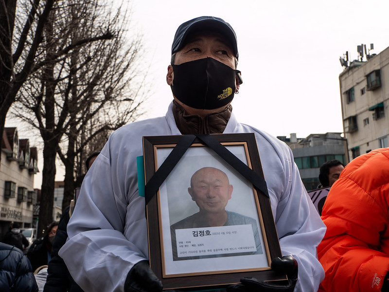 한 참여자가 김정호 전 사랑방마을주민협동회 이사장의 영정을 들고 행진하고 있다. 참세상 박도형 기자.