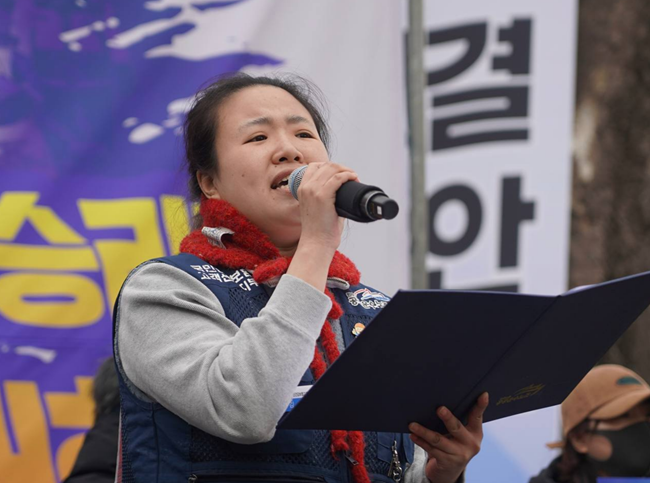 김금영 지부장은 “2021년 10월 21일 정규직 전환을 합의했지만 단 한 명의 전환도 이뤄지지 않았다”며 “이는 정책 실패가 아니라 방기”라고 말했다. 그는 공단이 제시한 전환 조건에 대해 “20년 가까이 현장을 지켜온 상담사들에게 다시 수습을 적용하고 평가하겠다는 것은 전환이 아니라 후퇴”라고 지적했다. 이어 “하청 시절 인정받았던 연차 승계를 부정하고, 외국인 상담사 38명의 전환을 배제하려는 것은 정규직 전환 가이드라인 취지에 반한다”고 밝혔다. 김 지부장은 “더 이상 물러설 곳이 없다”며 “정부와 공단이 책임 있게 해결할 때까지 곡기를 끊고 버티겠다”고 말했다.