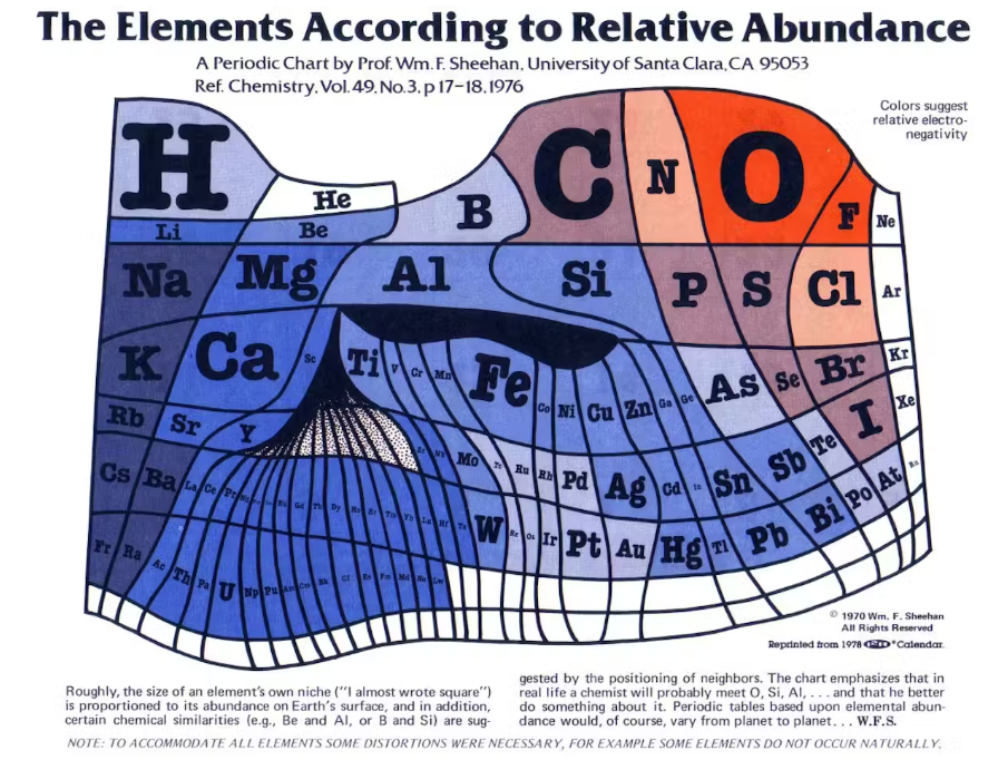 지구 표면에서의 원소 풍부도를 강조하도록 크기를 조정한 주기율표다더 풍부한 원소일수록 칸의 크기를 더 크게 표시했다출처윌리엄 F. 시핸(William F. Sheehan) / 산타클라라 대학교(Santa Clara University), CC BY