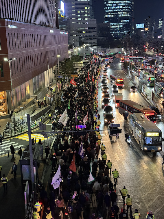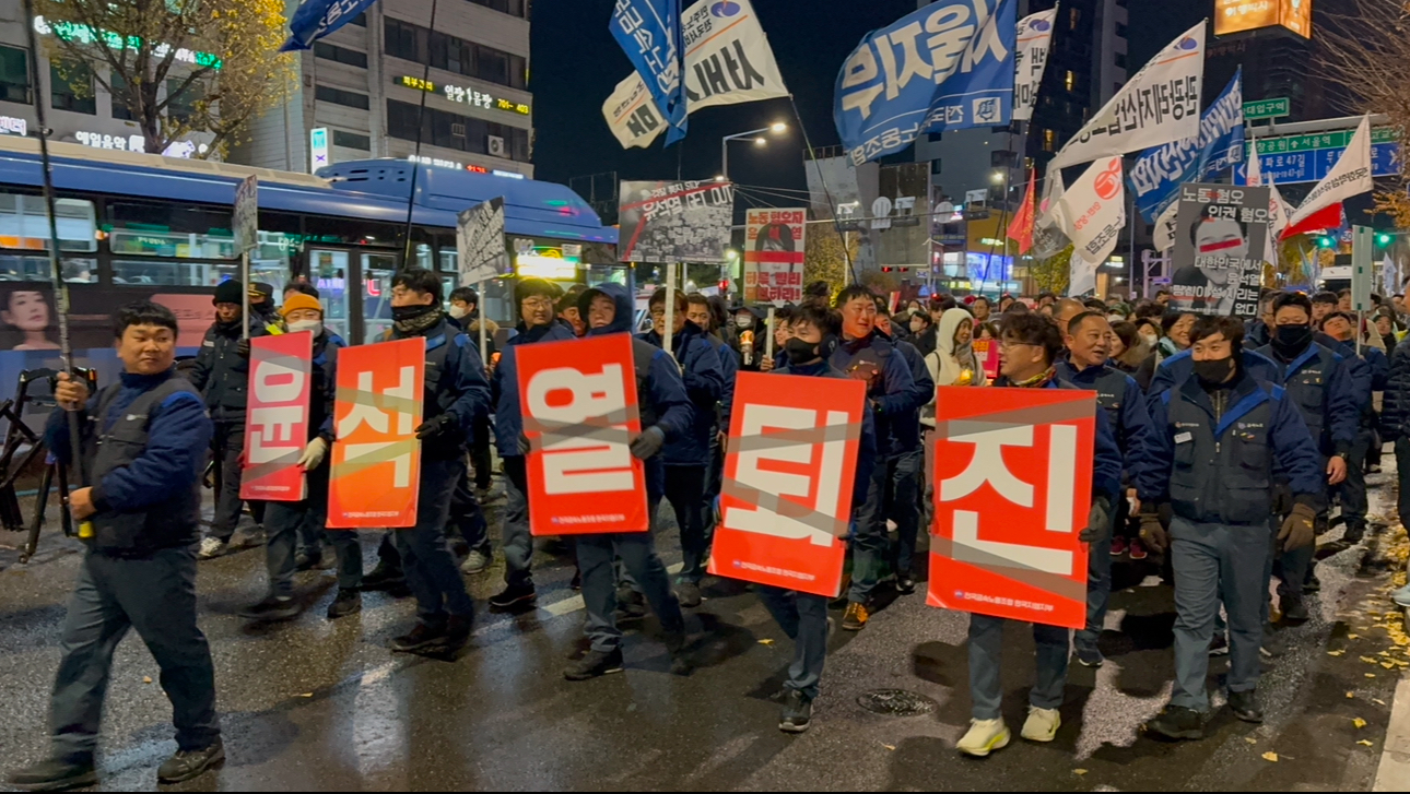 5일 저녁, 파업에 나선 노동자들과 시민들이 다시 광장에서 만났다. 촛불을 밝힌 노동자와 시민들은 "우리가 윤석열을 끌어 내리자"며 용산으로 향했다. 이들은 "범법자 윤석열, 지금 당장 체포하라", 계엄에 동조하고 탄핵에 반대하는 "국민의 힘도 해체하라"고 함께 외쳤다.