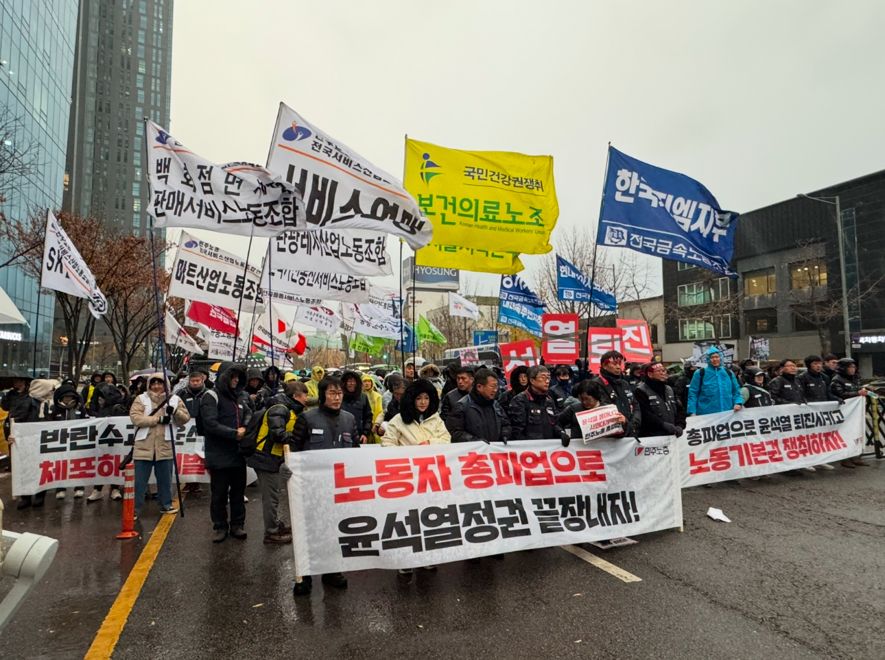 윤석열 퇴진시 까지 무기한 총파업을 선포한 민주노총은 촛불집회에 앞서 오후 4시 서울역에서 결의대회를 갖고 광화문으로 행진해 시민들과 만났다.