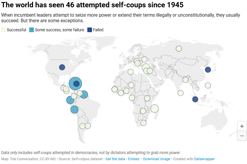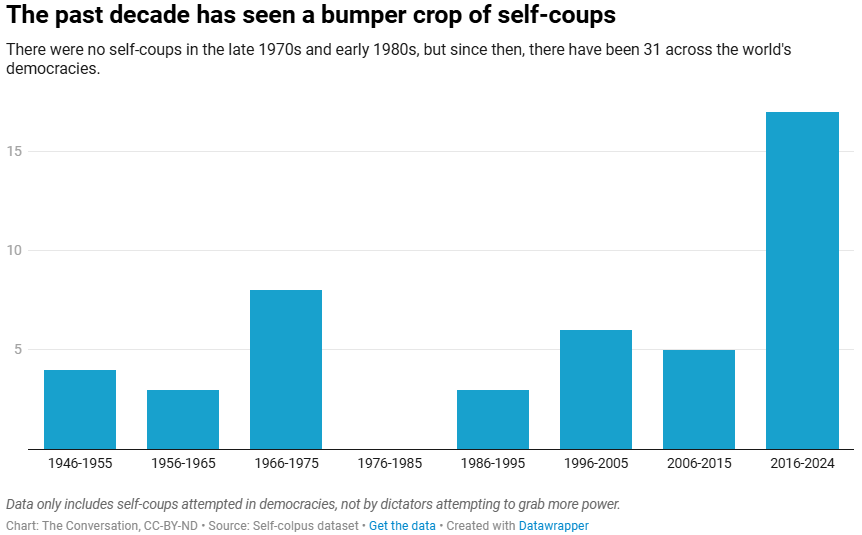 1946년 이후 민주적으로 선출된 지도자들에 의한 셀프 쿠데타 시도 중 3분의 1이 지난 10년 동안에 발생했다.