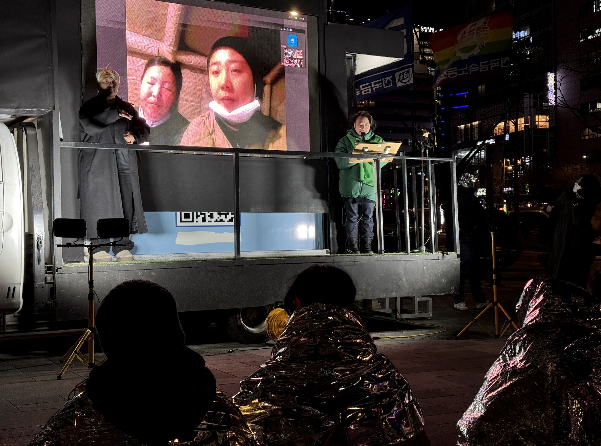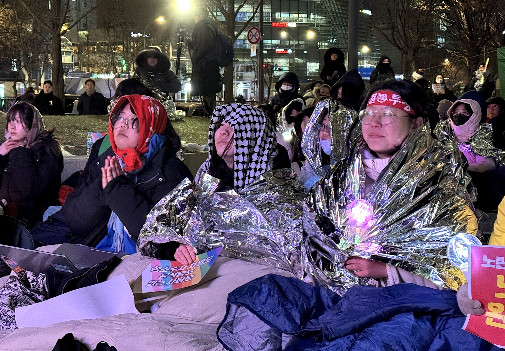 청계천로 빌딩 숲 사이 칼바람이 불었다. 천막도 없이 한밤을 지새운 조선 하청노동자들의 곁에 여성, 성소수자, 장애인, 시민, 또 다른 노동자, 누군가들이 자리했다. "우리는 이미 우리가 되었다"면서 "연대의 힘으로 윤석열을 퇴진시키자", "윤석열을 체포하고, 평등으로 가자"고 함께 외쳤다.