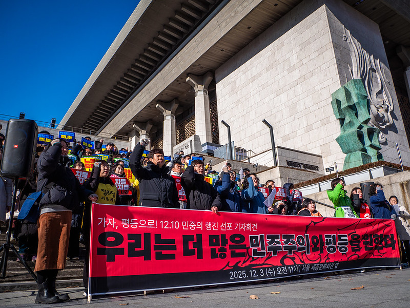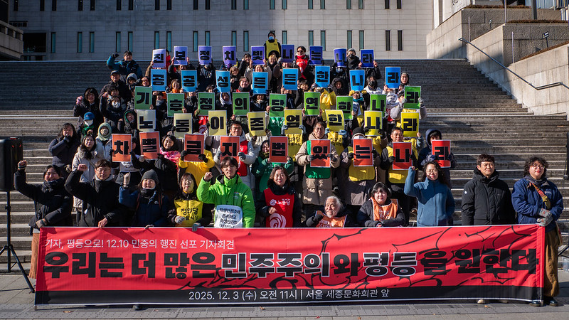 비상계엄 1년을 맞는 12월 3일 오전, 서울 종로구 세종문화회관 앞 계단에서 100여 명의 시민들이 함께 모여 <가자, 평등으로 12.10 민중의 행진>을 선포하는 기자회견을 열었다.