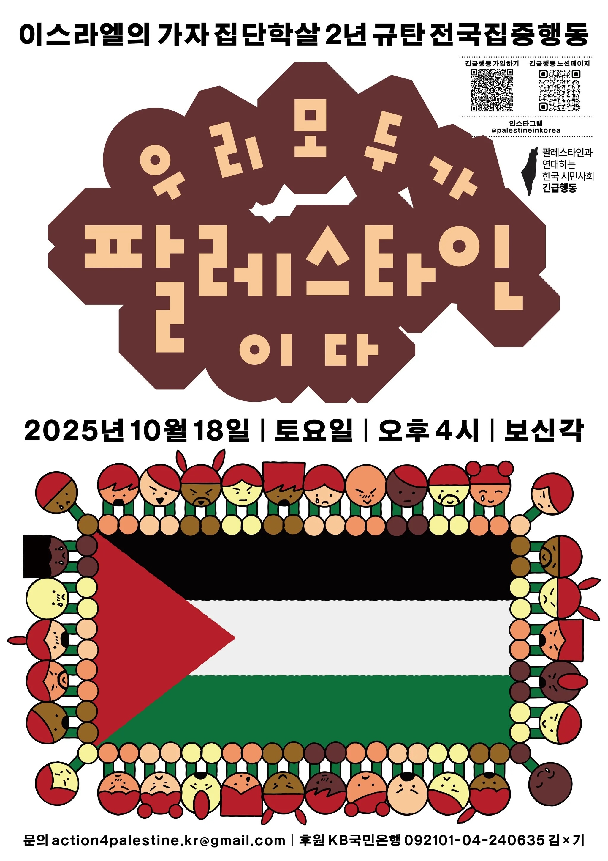팔레스타인과 연대하는 한국 시민사회 긴급행동(이하 ‘긴급행동’)은 오는 10월 18일 오후 4시 보신각에서 “우리 모두가 팔레스타인이다”라는 슬로건을 내걸고 “이스라엘의 가자집단학살 2년 규탄 전국집중행동”을 계획하고 있다. 또한 지난 13일부터 전국집중행동일인 18일까지를 “온라인 연대행동 주간”으로 삼고 다양한 온라인 캠페인을 이어간다. 13일과 14일은 “팔레스타인 연대 물품 자랑의 날”, “연대 책 읽기의 날”을 진행했고, 15일에는 이스라엘로부터 팔레스타인 해역 가스전 탐사권을 구매한 다국적 기업 ‘다나 패트롤리엄’의 지분 100%를 소유한 한국석유공사에 집단학살 공모 중단을 요구하는 온라인 행동을 벌였다. 16일에는 이스라엘 군수업체의 서울 국제 항공우주 및 방위산업 전시회(ADEX) 참여와 팔레스타인 집단학살에 동조하는 군수산업을 규탄하는 연대 활동을 벌인다.