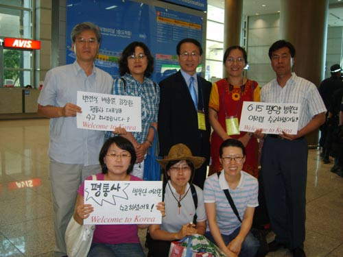 △ 방북한 평통사 임원들과 마중나간 회원들. 뒷줄 가운데가 김창환 대표. 이번 방문단에는 평통사를 대표하여 변연식 공동대표를 비롯, 배종렬, 진...