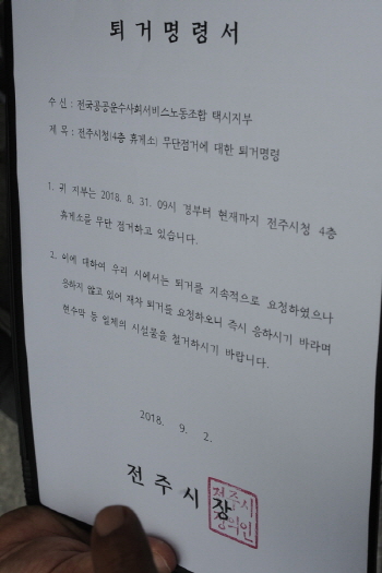 전주시가 2일 오후 4시 10분경 전주시청을 점거한 택시노동자들에게 퇴거명령서를 보냈다. 시청이 공권력 투입 절차를 밟는 것으로 보인다. 전주시...