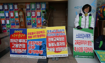 전북지역 학교비정규직 노동자들이 16일 저녁부터 전북교육청 1층 본관에서 농성에 들어갔다. 전북교육청의 비정규직 정규직 전환(무기계약직)이 상당...