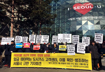 서울시청 앞에 도시가스 검침원들이 모여 임금 착복 문제를 방조하고 있는 서울시를 규탄했다. 이들은 최저임금에 가까운 임금과, 이마저도 착복당하는...