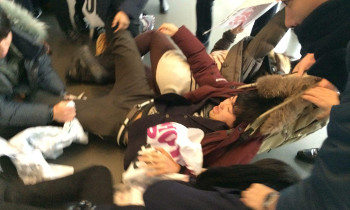 시민들이 강남 삼성전자 본관에서 기습 시위를 벌였다. 경비들은 철제 바리케이드로 시위 참가자들을 밀어내 위험한 상황을 초래했다.