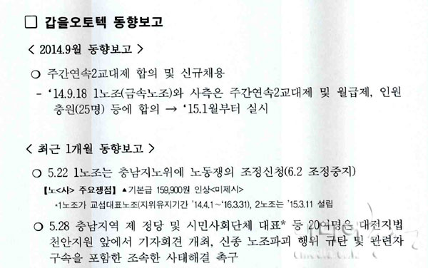 고용노동부 천안지청(아래 노동부)이 갑을오토텍 신종 노조파괴 사건에 대해 주요 사실관계를 정확하게 파악하지 않고 국회의원에게 허위 보고한 일이 ...