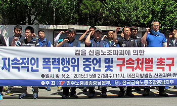 민주노총 세종충남지역본부가 2일 오전 11시 30분 대전지방법원 천안지원 앞에서 기자회견을 갖고 신종 노조파괴 공작의 책임자인 갑을오토텍 사측 ...