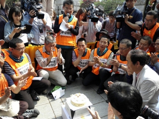 헌재 앞에서 ‘26살 전교조의 생일 케이크’를 앞에 놓고 축하노래를 부른 전교조 교사들의 모습은 어둡지 않았다. ‘헌재 결정 내용이 생각한 것보...