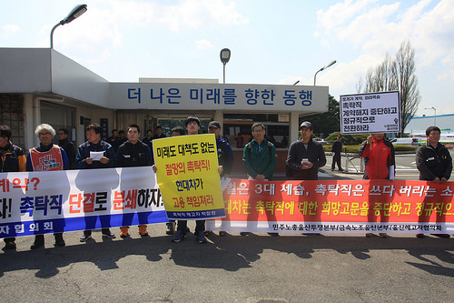 민주노총 울산투쟁본부 등 울산지역 노동단체는 14일 오후 현대자동차 정문 앞에서 기자회견을 열고 “현대차의 촉탁직 쪼개기 계약은 명백한 근로기준...