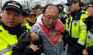 노동시장 구조개편을 위한 경제사회발전노사정위원회(노사정위) 논의 시한인 31일. 노사정위가 위치한 서울 광화문 정부종합청사 앞은 노사정 야합을 ...