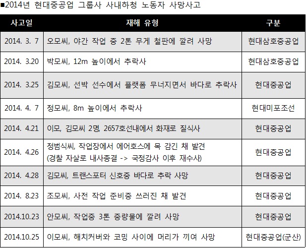 현대중공업에서 또 다시 하청노동자 사망사고가 발생했다. 올 한해 동안 현대중공업 그룹에서 발생한 열 번째 하청노동자 사망사고다.