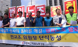 오는 19일 서울 행정법원의 전국교직원노동조합에 대한 법외노조 처분 1심 판결이 예정된 가운데, 9일 오전 김정훈 전교조 위원장이 광화문 정부청...