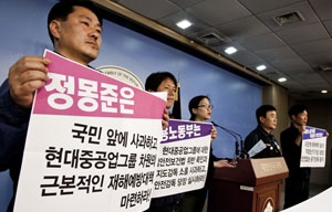 장하나 새정치연합 의원과 금속노조, 현대중공업 노동조합 등이 현대중공업그룹 조선소에서 연이어 산업재해로 사망한 노동자들에 대해 정몽준 의원의 대...