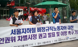 서울지하철 비정규직 노동자들이 서울시 등에 국가인권위원회의 차별시정 권고 이행을 촉구했다. 민주노총 공공운수노조연맹 서울지역본부는 6일 오전, ...