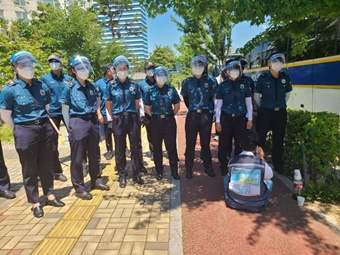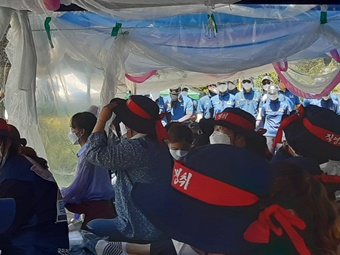 원주시의 노조 집회 금지에 경찰, 농성장 주변 차 벽 설치