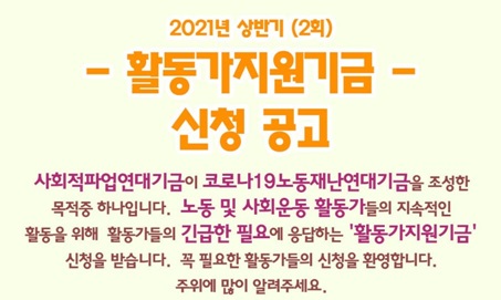 사회적파업연대기금(사파기금)이 올해 상반기 500만 원의 기금을 노동‧사회운동 활동가들에게 지원한다. 대상은 노동 및 사회운동 활동가이며, 용도...