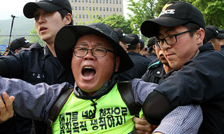 경찰이 4일 오후 정부과천청사 앞에서 방하남 고용노동부 장관 면담을 요구하던 전국공무원노조 조합원 40여명을 강제 연행했다. 노조는 노조설립신고...