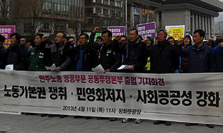 민주노총은 11일 오전 서울 광화문 광장에서 기자회견을 열고 ‘공공부문 노동기본권 쟁취와 민영화 저지·사회공공성 강화를 위한 공동투쟁본부(공공부...