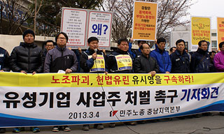 최만정 민주노총 충남본부장, 박창식 전국금속노조 충남지부장이 4일 대전지방검찰청 천안지청에서 유성기업 사업주 구속수사와 엄중 처벌을 촉구하는 무...
