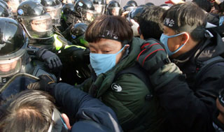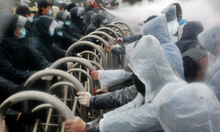 한진중공업 앞, ‘물품반입’ 놓고 경찰과 시위대 충돌