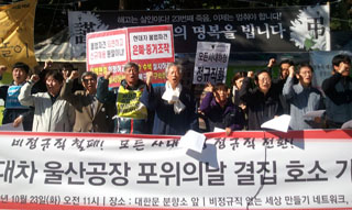 현대차 비정규직 노동자 두 명이 7일째 송전탑 고공농성을 이어가고 있는 가운데 노동시민사회단체들이 울산에 집결한다.