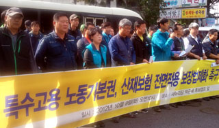 건설, 화물, 학습지, 간병 등 특수고용노동자들이 새누리당사 앞 노숙농성에 돌입했다. 이들은 특수고용 관련 노조법과 산재보험법 개정을 요구하고 ...