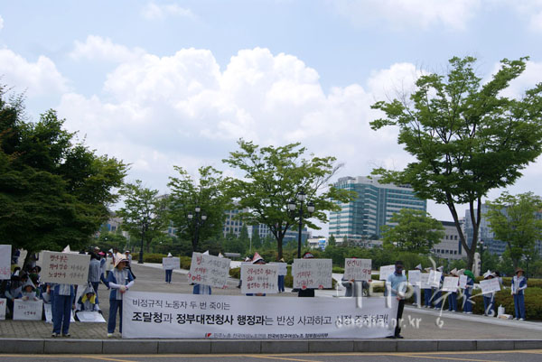 민주노총 전국여성노조연맹 전국비정규여성노조 정부청사지부 조합원 80여 명은 5일 11시 40분 대전 정부청사 앞에서 집회를 갖고 ‘행정지침에 따...